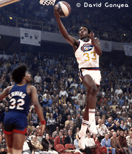 It was David Thompson's rookie year - Thompson (#33, below right) chose to sign with the ABA Nuggets instead of the NBA Atlanta Hawks, and turned out to be the best Nugget ever. Thompson was the ABA Rookie of the Year for the 1975-76 season, and also won the MVP award in the 1976 All-Star Game. He also participated in the very first first slam dunk contest at halftime of that All-Star Game.