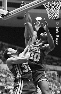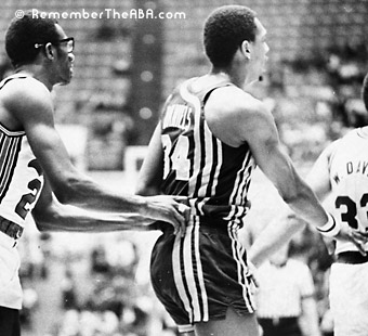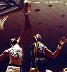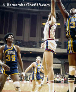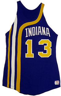 Many of the Pacers who wore this jersey are legends in their own right: Roger Brown (at right photo, # 35), Mel Daniels (at left photos, #34), George McGinnis (at right photo, #30), Freddie Lewis, Billy Keller and Bob Netolicky. |