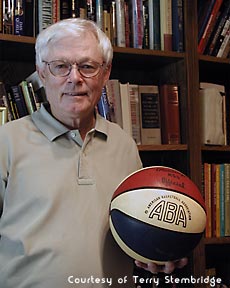 Terry Stembridge poses with the ABA basketball used in the last game ever played by the Dallas Chaparrals. The game was played at Moody Coliseum on March 26, 1973 in front of only 130 fans. Ted "Hound Dog" McClain of the Carolina Cougars blocked a Dallas shot at the final buzzer, and the ball landed at Terry's position at press row. |