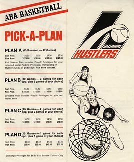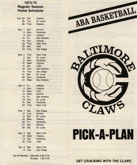 A Tale of Two Brochures: It was definitely the "worst" of times for the ABA, at least in Baltimore. The team first tried to sell itself as the Baltimore "Hustlers." The ABA league office pondered the implications of this for about two seconds - and then informed the Baltimore owners that it should pick a new name. Immediately. The owners scrambled to put out a second brochure. This time they picked the name that stuck: the Claws.
