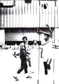 At top middle, Wise flips in a hook shot at an open Claws practice held at the Baltimore Civic Center. Claws players usually elected to practice even though they weren't being paid. The Claws only had used t-shirts available to the players - Claws practice jerseys would have broken the bank.
