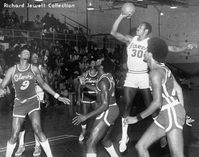 In a sight familiar to ABA fans, George McGinnis (#30) skies for his one-handed jumper against Claws players (from left to right) Mel Daniels, Chuck Williams, George Carter and Stew Johnson. This might be McGinnis' first game in the NBA after jumping to the 76ers from the ABA Pacers.