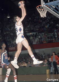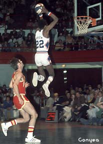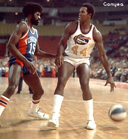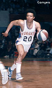 The team boasted two Hall of Fame players, Dan Issel (above right, #25) and David Thompson (above left, #33, dunking over George Karl of the Spurs). Ralph Simpson (right, #44) had another career year playing for Larry Brown. And Bobby Jones (above middle) continued to amaze ABA fans with his overall play. Simpson was named to the First Team ABA All-Pro Team. Issel, Thompson and Jones were all named to the Second Team ABA All-Pro team. Thompson also was the ABA All-Star Game MVP and Rookie of the Year. (photos courtesy of Dave Gonyea) |
