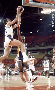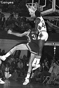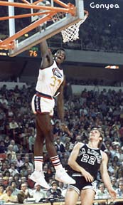 Feisty guard Mack Calvin (above middle, #20) had one of his best years ever, averaging 19.5 points and a league-leading 7.7 assists per game. Rookie Bobby Jones (above left) arrived from the North Carolina Tarheels, choosing to sign with the Nuggets instead of the Houston Rockets of the NBA. Jones gradually gained the attention of the entire league during his rookie year. His defense was spectacular, and his leaping ability amazed everyone. He topped the ABA in field goal percentage with a .604 mark. At the end of the 1973-74 season, guard Ralph Simpson (at left, #44, with the vicious dunk over Virginia's George Irvine) had demanded a trade out of Denver, citing a personality conflict with coach Alex Hannum. But playing in Larry Brown's "passing game" system resurrected Simpson's career. During the 1974-75 season, Simpson averaged 20.6 points and 5.4 assists per contest. Center Mike Green (above right, #22) had his best year as a pro, averaging 17.4 points and 9.2 rebounds per game. Calvin, Simpson and Green all played in the 1975 ABA All-Star Game at San Antonio. Their coach in that game? Larry Brown got the honor due to the Nuggets' stellar record. |