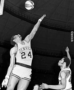 | ABA MVP and Rookie of the Year Spencer Haywood (above left, #24) fueled the Rockets' drive to the 1969-70 Western Division Title. Haywood was Denver's first pro basketball superstar. He became a tremendous gate attraction: in the spring of 1970, nearly every Rockets game in Denver's small Auditorium Arena was sold out.