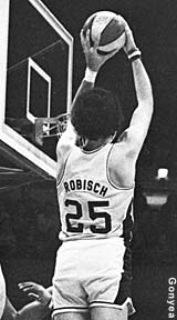 Behind Simpson's scoring and Brown's playmaking, the Rockets barely made the playoffs (ahead of the hapless last-place Memphis Pros), and had to face the powerful Indiana Pacers in the first round. Surprisingly, the Rockets gave the favored Pacers all they could handle, and nearly pulled off a memorable upset. According to the Indianapolis press, Dave Robisch suddenly played "like Superman" in this series. He battled the Pacers' All-Star center Mel Daniels to a virtual draw in each every game. Simpson also gave the Pacers fits with his slashing drives and jumpers (in Game 2 at Indianapolis, Simpson hit a floating jumper with 4 seconds left to give the Rockets a 106-105 victory). At several points during this seven-game series, the Rockets had the chance to take control. But, the Pacers always seemed to bounce back. The series came down to a decisive Game 7, which was played at Indianapolis. For Indiana fans at the game, and for Denver fans listening on the radio, this game was truly a nail-biter. With ten seconds left in the 4th quarter, the Pacers' Billy Keller hit a crucial free throw to give Indiana a slim 91-89 lead. With four seconds left in regulation, the Rockets had the ball and a chance to send the contest into overtime. Dave Robisch took the ball out of bounds underneath the Denver basket, and tried to throw a quick, short inbounds pass to Ralph Simpson. The Pacers deflected the pass, and time ran out -- giving Indiana a heart-stopping, series-clinching two point win. After seven grueling games against the Rockets, the Pacers were relieved to advance. After this first-round scare, the Pacers went on to beat Utah and New York in succession for their second ABA Championship.