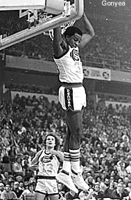 The last hurrah was that year's ABA finals, in which Erving overcame Thompson and the Nuggets. Erving won the first game almost single-handed, scoring 48 points or so including a last second bucket to clinch it as my girlfriend (now my wife!) and I listened helplessly to Al Albert on the radio. During that series, Scheer crammed more than 19,000 fans into McNichols, adding temporary bleachers and selling standing room tickets until the Fire Marshal cracked down. And of course, my heart was broken when the Nets overcame a third quarter 22-point deficit to win game 6 and capture the last league title."