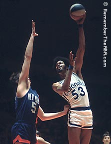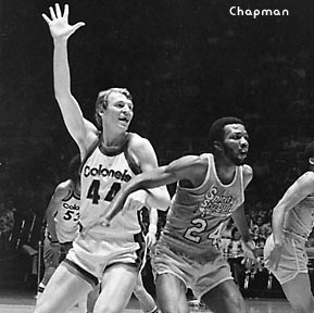 Issel was a prolific and feared scorer for the Colonels. His favorite gambit was to lure frustrated opponents (centers and forwards alike) out of the paint by hitting a few of his long range "Issel Missiles." Then, Issel would apply his famous head-fake and blow past these helpless opponents for easy driving layups. Issel played in six straight ABA All-Star games, earning MVP honors in the 1971-72 game played in Louisville. Gilmore established himself early on as one of the most intimidating defensive forces in either league. The NBA team with his rights, the Chicago Bulls, only agreed to the NBA-ABA merger after receiving the number one pick in the ABA dispersal draft. The Bulls used that pick to select Gilmore. |