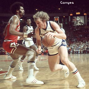Artis Gilmore (above left and right, #53) landed with the Chicago Bulls and made six NBA All-Star teams. Maurice Lucas (above right, #20) joined the Portland Trailblazers - and immediately became known as "The Enforcer" due to his physical play. He helped the Blazers to the 1976-77 title and made four NBA All-Star teams. And, Dan Issel (right, with the wild hair) stayed with the Denver Nuggets for the rest of his career - he scored 14,659 NBA points, boosting his pro total to an amazing 27,482 points - a total that is currently 7th best in pro history. |