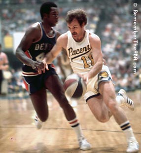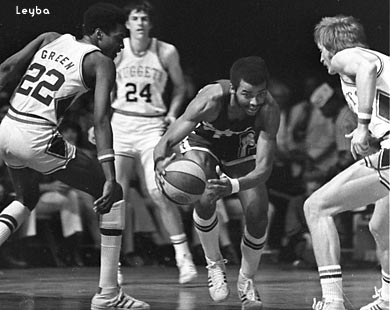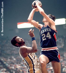An irritated McGinnis took the ball at the top of the key and stormed down the lane for a driving layup with 1:17 to play.  But on the way, he drove into Denver's Byron Beck, Bobby Jones and Mike Green.  Beck went flying, and referee John Vanak came out of the scrum to call McGinnis for charging. The offensive foul took away the basket - and a potential game-tying free-throw - from Indiana.  Denver used the next possession to run down the clock - and with 50 seconds left, Green calmly hit a 20-foot jumper to give Denver a 102-97 lead. After a basket by Billy Keller (below # 11) cut the margin back to three points, Mack Calvin sealed the win with two crucial free throws.