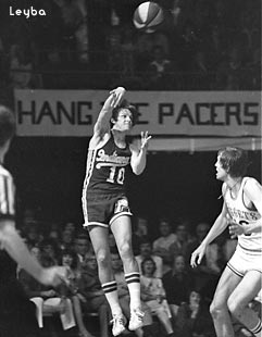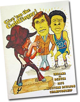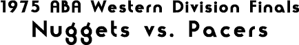 The Pacers were viewed as a pesky opponent for the Nuggets in the Western Division Finals, but no one expected the bizarre and memorable series that occurred.  It involved unlikely twists and turns in momentum, elaborate hexes and spells (courtesy of the mascots imported by each team), griping coaches, and, ultimately, one of the biggest playoff upsets in ABA history.  Not even a single game of this series was shown on national television - the following summaries will give you an idea of how this series unfolded.