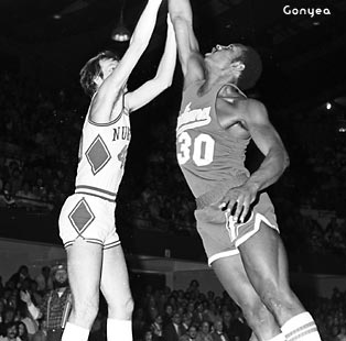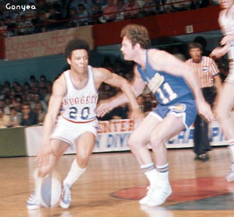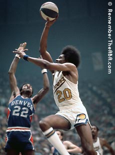 Mack Calvin (# 20, at left, with 22 points and 9 assists) and Ralph Simpson (below, with 29 points) played well for Denver, but the real surprise was forward Dave Robisch. Robisch started along with Mike Green and Bobby Jones on Denver's front line, and hit the first five shots he took. Robisch scored 16 points in the first half and ended up with 28.  "It was Mack, Ralph and Robisch," Indiana coach Slick Leonard said.  "If anything, Robisch was the difference.  You figure Mack and Ralph are going to hurt you, Dave was really the difference."