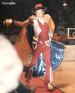 GAME SUMMARY (by Al Hoffman and Arthur Hundhausen): In a brazen bid to shake up Denver's psyche, the Pacers imported their secret weapon to Denver - super-mascot Dancin' Harry.  To the confusion of a standing-room only crowd of 7,491, Dancin' Harry (at left) put a pre-game hex on the Nuggets.  The hex worked like a charm, as the Pacers got a 131-124 win and stole the home-court advantage from Denver.