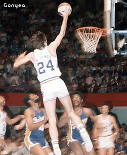 McGinnis literally did everything to carry Indiana to the Game 7 win - he scored 40 points, grabbed 23 rebounds, dished 8 assists, and made 3 steals.  He also scored 10 of Indiana’s last 14 points - the key basket was a 3-pointer with 3:54 left that expanded Indiana's lead to 96-92.  "I never hesitated on that one," McGinnis noted after the game.  "I thought it was a big play for us at the time.  And looking back, it sure was.  Then I got two goal-tending calls after that.  Yeah, I'd say they were questionable.  But then I think there have been questionable calls throughout this series, especially that charge on me in the last game." Roger Brown described McGinnis' performance this way:   "George smelled victory going down towards the end of that game and he went to the boards like a wild man, or the 'bull' they say he is."  After the final horn, in a display of class, McGinnis visited the Denver bench and embraced all of the Nuggets.