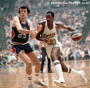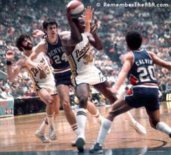 GAME SUMMARY (by Al Hoffman and Arthur Hundhausen): George McGinnis (# 30, right and below) snatched all momentum that Denver had built over the first three quarters of Game 3 and turned Market Square Arena into his own personal playground. McGinnis' 32 points, 21 rebounds and 14 assists helped push Indiana to an unlikely 118-112 win and a 2-1 lead in the series.  McGinnis summed it up by saying:  "We were damn lucky.  We shouldn't have won that game.  They had it.  We were just really lucky.  We beat 'em in one quarter and won the game."