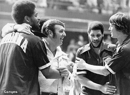 In the victorious Pacers locker room, Coach Slick Leonard (below) was quick to compliment Indiana's rookies - Billy Knight, Len Elmore and Kevin Joyce - on a well-played series:  "They developed a lot of confidence throughout the year and really made the season for us.  But this has been one great series.  We had six sellouts and 15,000 the other night back home."  Asked about his beef with the referees after Game 6, and the officiating in Game 7, he simply stated:  "When you lose, you're unhappy.  I don't like to think that referees contribute to the winning and losing of a game.  Really, I think the last game was the only one out of twelve we played this year where it was a true factor.  But hell, all the damn complaining I'm gonna do isn't going to change anything."   Finally, on winning Game 7 and moving on to play Kentucky in the ABA FInals, he noted:  "We were a little tense at the start, trying to hurry things and getting fouled up.  I told 'em in a time out to take their time, and they did.  Then we got things smoothed out and got the job done.  Kentucky?  The hell with the next game, I'm going to enjoy this one awhile."