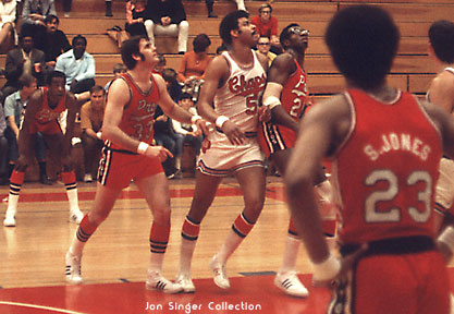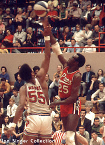 The four players in the above left photo (from left to right, Jimmy Jones, Wendell Ladner, Gerard Govan and Steve "Snapper" Jones) caused a lot of problems for ABA opponents. Steve Jones was a dangerous jump shooter. Jimmy Jones (also at left, # 15) could score from anywhere. Govan (also above right, # 25) was a feared rebounder. And Ladner was just feared, period. With the hard-working Wil Jones (#11, at left) also in the mix, the Pros were a good team. |