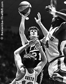 The blockbuster deal was a three-for-three trade with the Carolina Cougars. Memphis gave up its two top scorers at the time: scrappy and popular Wendell Ladner (above right, # 33) and fourth-year man Bobby Warren (above left, # 21). Memphis also parted with 6'10" rookie center Tom Owens. In return, Memphis received George Lehmann, Warren Davis and Randy Denton. After playing in only 15 games, Lehmann got hurt and sat out the rest of the year. The Pros were 16-33 when the trade was made, and 10-35 the rest of the way. Most of the scoring load after the trade fell on brash rookie guard Johnny Neumann (right, #14). In college, Neumann had been compared to Pete Maravich due to his high scoring average. With the Pros, Neumann occasionally showed flashes of scoring brilliance. But more often than not he bickered with Coach McCarthy and struggled on the court, especially on defense. |