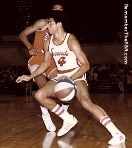 On October 22, 1974, the Sounds played their own home opener against the San Diego Conquistadors (photo at right). A semi-curious crowd of 4,010 showed up at the Mid-South Coliseum only to go home disappointed. The Sounds played no defense. Travis "Machine Gun" Grant, a San Diego guard, played only 22 minutes, but went 15 of 21 from the floor and 11 for 11 from the line (with 15 of his 41 points in the 4th quarter) to lead the Q's to a 109-106 come-from-behind victory. Lewis once again led the Sounds in scoring with 25 points (15 of them in the fourth quarter).
