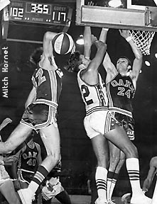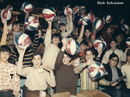 About the only time the Nets could count on a semi-respectable crowd was when the team held a special "ABA Ball Night" (photo of excited participants at above left) The Nets quickly learned that a free red, white and blue basketball was a sure-fire way of attracting swarms of kids - and their parents/scoutmasters - to a home game featuring a relatively unknown ABA opponent.