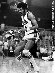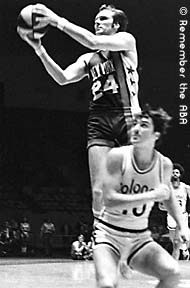 Julius Erving (#32, above left) won the ABA MVP award that year (his first year with the Nets). Dr. J carried the Nets night in and night out. 6'9" forward Larry Kenon (#35, above middle), was an ABA all-rookie and All-Star selection in 1973-74. Known as "Mr. K," Kenon established a reputation as one of the finest offensive rebounders in the ABA. "The Whopper" Billy Paultz (above right, setting a pick) provided a physical presence in the middle, averaging just over two blocks and ten rebounds per game. And rookie guard "Super John" Williamson (#23, above right) dominated games with his physical play. Second-year guard Brian Taylor (#14, left) was a defensive-stopper and a three-point shooting wizard. |