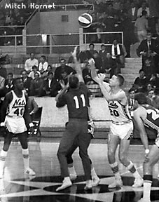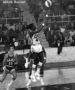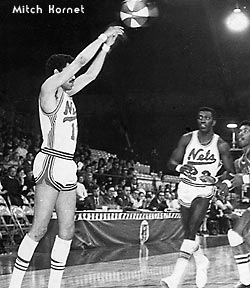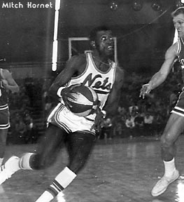The Nets best and most consistent player during the 1968-69 season was Walt Simon (#4 at right, driving against Roger Brown of the Pacers) - one of the few original Americans who managed survive the roster turnover. Simon averaged eight rebounds per game to go along with his 20.5 ppg scoring average. Observers noted his good outside jumper, with a quick release. He also had the speed and the hands to rank among the best driving forwards in the ABA. Finally, he was unselfish - he led the Nets in assists. Simon wasn't shy about voicing his frustration with the team's constant losing and poor situation: "The first thing is I get mad. I've lost my temper and told some of my teammates I didn't think they were going as hard as I think they can." On his future with the team, Simon was blunt, saying that: "We're going to be getting a new coach next year. I don't know whether he'll think I fit into his system. Maybe he'll want to change the whole ball club around, bring in all new players. The way we've lost this year, that could easily happen. I'm sure I'll be playing in the ABA next year, but not necessarily for this team."