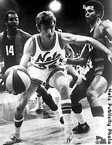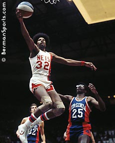In 1973, Julius ("Dr. J") Erving came back to New York -- his hometown -- and kindled nationwide interest in the red, white and blue league. To many basketball fans, Erving's colorful highwire act with the Nets became the image of the ABA itself. During his three years with the team, Erving won the ABA MVP Award three times. The Nets won the ABA title two out of those three years.