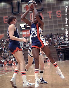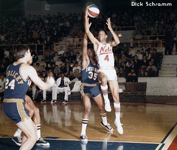 Next, the Nets faced Julius Erving and the favored Virginia Squires in the Eastern Division Finals. The Squires easily won the first two games in Virginia, with Dr. J scoring 26 points in Game 1 and 38 points in Game 2. It looked like the Nets were on the ropes. But, in a bizarre turn of events, the series was delayed for 10 days after Game 2. The delay occurred because Nassau Coliseum was booked (and nobody wanted any playoff games to take place at the Island Garden). The long layoff enabled the Nets to regroup and heal some injuries. When the series finally resumed, the Nets took both games at home to even the series at 2 games apiece. The teams traded victories in Game 5 and 6 to leave the series tied 3-3. The decisive Game 7 was at Norfolk in front of 10,410 fans, and Julius Erving had a big game (35 points). But behind a Rick Barry three-pointer in the final minute, the Nets prevailed 94-88 and moved on. Finally, in the ABA Championship Series, the Nets lost to the Indiana Pacers, but gave Indiana all it could handle in six hectic games.