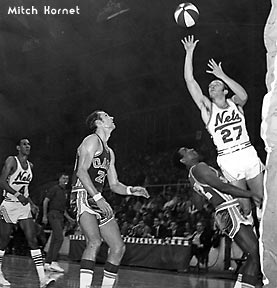 the hockey boards behind the action). At the beginning of the 1968-69 season, the team looked just like its immediate predecessor, the New Jersey Americans. With the exception of the scripted "Nets" on the front, the uniforms looked exactly the same - even down to the shorts. The Nets' court and scoreboard (above middle and above right) were imported directly from the Teaneck Armory. The players were familiar too - Levern Tart (above left # 40, with the fingerroll against the Oaks' Larry Brown) was still jacking up shots from everywhere - and making them. Dan Anderson (above middle, # 20, with the center jump) was still trying his best to anchor the middle. But these familiar faces didn't get very comfortable at Commack. Management undertook a purge of almost all of the remaining Americans after the Nets' terrible start. After only 25 games, Anderson was shipped to the Kentucky Colonels. Tart's turn came soon after that - he was sent to the Houston Mavericks. In December the team brought in a parade of new players. Ron Perry (above right, # 22) came from the Miami Floridians. Bob Verga (right, # 27) came from the Denver Rockets. But even these new players didn't last the year - on January 31, 1969 the Nets traded Verga to the Houston Mavericks and Perry to the Indiana Pacers. This turnover was not unusual - over the course of the 1968-69 season, an amazing 23 different players wore a Nets uniform. |