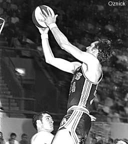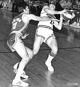 When he actually played during the 1968-69 campaign, Rick Barry (#24, above left) was devastating. When Barry was out (which was most of the season), the Oaks still dominated their opponents with pesky defense and an outstanding fast break. Guard Larry Brown (#11, above right) was the ringleader most nights. Photos copyright John Oznick and used with permission. |
