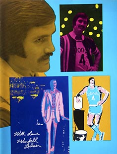 In 1973, the Colonels decided to capitalize on Ladner's good looks by producing a "beefcake" poster (above left). The team had him pose (a la Burt Reynolds in Cosmopolitan magazine) wearing only his Colonels shorts, and holding a red, white and blue ABA basketball. The posters were so popular that they sold out in only a few days.