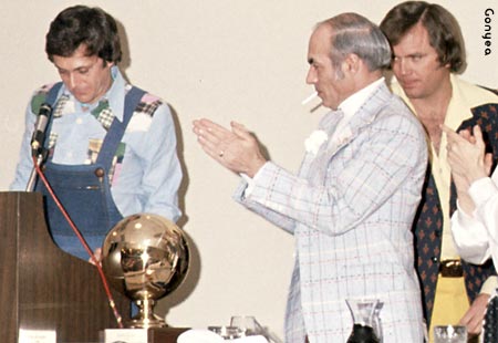 He was very fond of wearing Oshkosh B'Gosh farmers' overalls (above left) to games and press conferences. And check out Brown yelling at the refs in his groovy rainbow sweater (above right)!