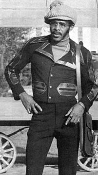"The newest member of the Stars recently showed us his favorite fashion ideas. Larry chose to see the sights (or was the sight to see!) in Arrow Press Square in a black doubleknit two-piece pants and battlejack, accentuated with red and lavender leather strips. For the total individual look, Larry topped his outfit with a red looseknit beret, and the latest in men's fashions -- a shoulder strap carryall!"