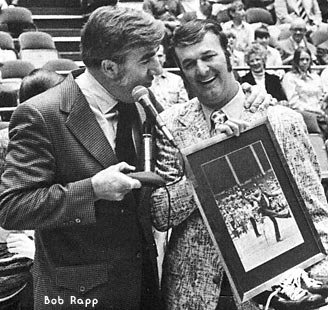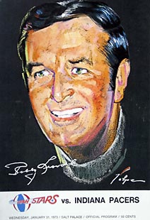 Showing a good sense of humor, Stars management turned the tirade into a unique promotion. The next time the Pacers visited Salt Lake City, the Stars put Leonard on the cover of the official game program (left). And, before the game, Stars GM Vince Boryla gave a special gift to the temperamental Pacers coach: he presented Leonard with a framed photo of the incident (photo above right). At least for that one moment, Slick broke out with a big smile on a rival team's court.