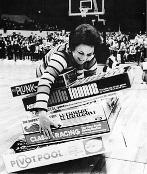 At above right, a very lucky Squires fan shows her jubilation at winning a huge pile of exciting board games, including "Pivot Pool," "Class A Racing," "Skittle Tennis," and, everyone's favorite, "Ker-Plunk!"
