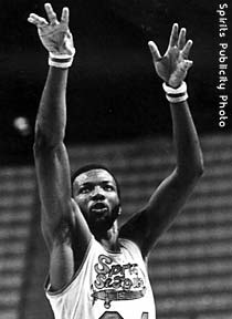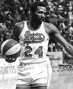Out of Providence College, precocious rookie Marvin Barnes (below, #24) had a huge (if not tumultuous) year for the Spirits in 1974-75, averaging double figures in scoring (24.0 ppg) and rebounding (15.6 rpg). A month into the season, after teasing Spirits fans with his spectacular play, Barnes suddenly left the team. His location was a complete mystery, and the Spirits were forced to play on without him. After a few days in the dark, the Spirits front office finally learned that Barnes was in Dayton, Ohio (at a pool tournament!) with his agent. Marvin was unhappy with his contract and had bolted the team in order to get his point across. Fortunately for all parties involved, Spirits management persuaded Marvin to return to St. Louis and rejoin the team.
