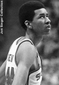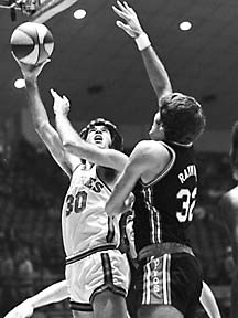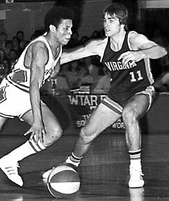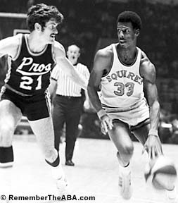 Doug Moe (above right, #15) had played with the franchise during its second year in Oakland (the 1968-69 championship year). After one season with the Carolina Cougars, Moe was reunited with longtime friend and teammate Larry Brown. While Moe's knees were beginning to give out, he still averaged 13.0 points. The Squires' "super-rookies" included Charlie Scott (above middle, #33) and George Irvine (right, # 30). Scott certainly didn't look like a rookie in 1970-71. He tore through ABA defenses, averaging 27.1 points (5th in the ABA) and 5.6 assists (4th in the ABA). Scott shared the 70-71 ABA Rookie of the Year award with Dan Issel of the Kentucky. Irvine didn't play much that year, but he demonstrated a fine shooting touch, hitting an impressive 56% from the floor. Virginia also added Neil Johnson (above left). Johnson came to the Squires from the NBA Phoenix Suns. Johnson's rugged style was a good fit in the ABA. Johnson quickly took on the role of the team's "enforcer," and became a fan favorite. |