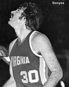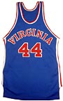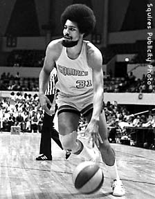 The Squires already had budding superstar Charlie Scott. But they also added an unheralded rookie from the University of Massachusetts, Julius Erving (#32, above left and above middle). Squires fans in Norfolk, Richmond and Hampton soon learned that Erving's nickname was "Dr. J" (because he "operated" on the court). They also learned that Erving was a master of soaring dunks, reverse spinning layups, and floating fingerrolls. When Virginia played in other ABA cities, fans came to the games just to see if Dr. J was the "real deal." He was. However, Erving and Scott were not destined to play together for very long. The high-scoring Scott bolted the Squires on March 10, 1972 to join the NBA's Phoenix Suns. And Erving tried to leave the Squires for the NBA's Atlanta Hawks in the fall of 1972. Although Erving was forced by the courts to return to the Squires, Virginia was financially unable to keep him for long. He was traded to the New York Nets after a brilliant 1972-73 campaign. In the midst of all this turmoil, the Squires did keep some good players (at least for a while). Center Jim Eakins (right, #42) was with the Squires in their very first year in Virginia (1970-71), along with defensive ace Fatty Taylor (above right, #14). Both Eakins and Taylor went elsewhere after the 1973-74 season, but became Squires once again for Virginia's last, dismal season (1975-76). |